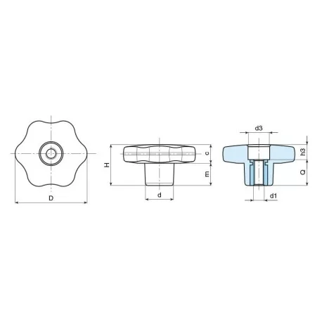6-punkts håndhjul med innvendig gjenge som er støpt i kraftig forsterket nylon med innsatser i messing og rustfritt stål. Disse produktene er egnet for medisinsk utstyr og matvarebehandlingsutstyr, inkludert mange andre industrielle applikasjoner.